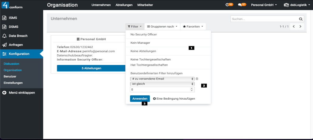 - Unter der Schaltfläche „Filter“ , befinden sich mehrere vordefinierte Filter, sowie die Möglichkeit, einen eigenen Filter zu erstellen. Mit der Schaltfläche „Anwenden“ , verwenden sie ihren eingestellten Filter.