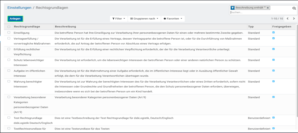 - Nach Auswahl der Schaltfläche „Anlegen“ in der Übersicht, oder durch Auswahl der Schaltfläche „Anlegen„, in der ausgewählten Rechtsgrundlage, gelangen Sie zur Erstellung einer neuen Grundlage.