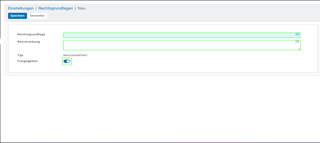 - 2. Unter dem Punkt „Rechtsgrundlage“ , vergeben Sie den gewünschten Namen der Rechtsgrundlage. Im Feld „Beschreibung„, werden zusätzliche Informationen festgehalten, welche die Rechtsgrundlage betreffen. Nach Abschluss der Eingaben und Überprüfung der Korrektheit der Eingaben, kann die Rechtsgrundlage durch das Feld „Freigeben“ , aktiviert werden, sofern der Benutzer die benötigten Rechte dafür hat. Als letzten Schritt wird die Rechtsgrundlage durch die Schaltfläche „Speichern“ , abgespeichert.
