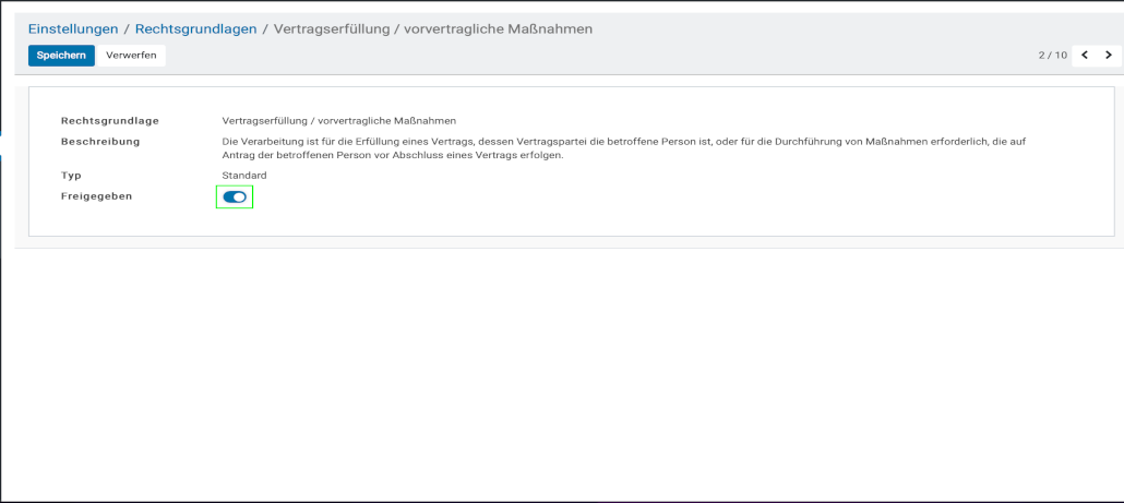 - Im Bearbeitungsmodus, können Sie mit den benötigten Rechten, die Rechtsgrundlage festlegen, ob diese eine „Freigabe“ hat oder nicht. Nach Abschluss der Einstellungen muss diese nur noch mit der Schaltfläche „Speichern“ , gesichert werden.