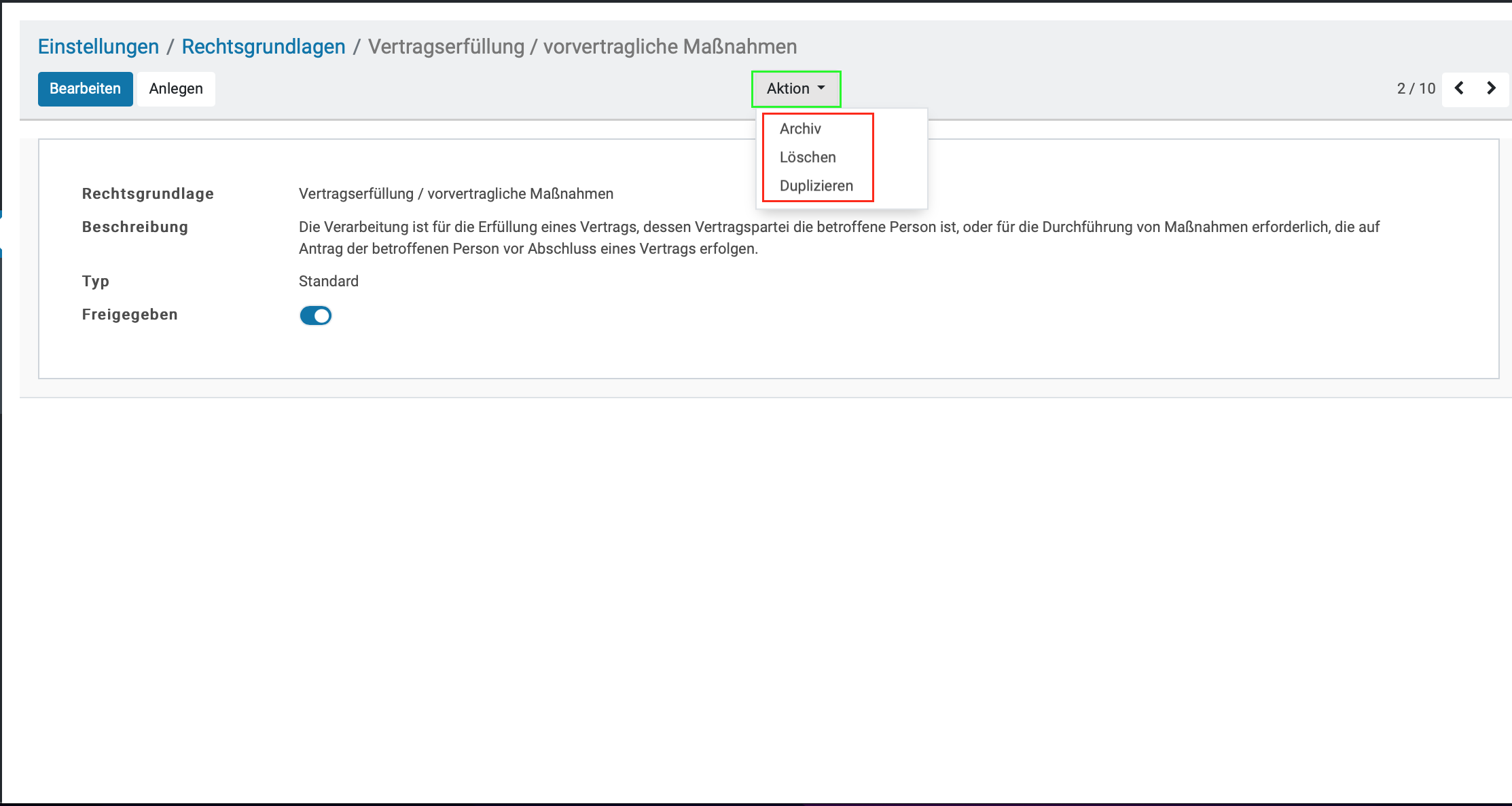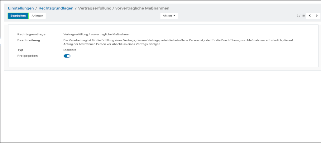 - Um die ausgewählte Rechtsgrundlage zu bearbeiten, müssen Sie in den Bearbeitungsmodus der jeweiligen Karte. Dies erreichen Sie durch auswählen der Schaltfläche „Bearbeiten„.