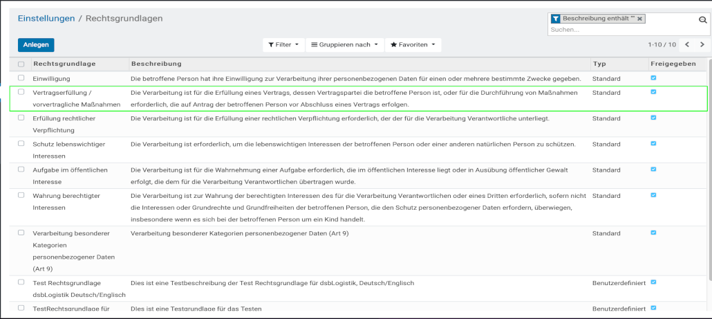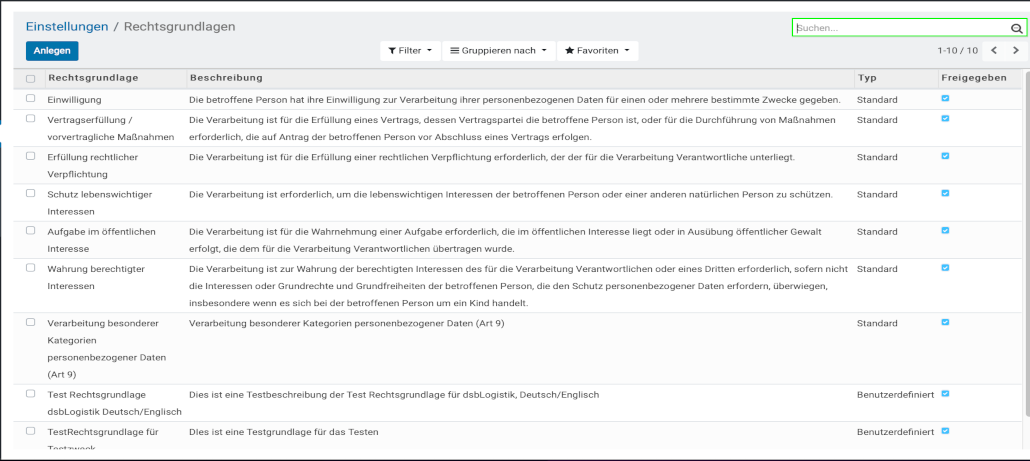 - Nach Auswahl der Schaltfläche „Anlegen“ in der Übersicht, oder durch Auswahl der Schaltfläche „Anlegen„, in der ausgewählten Rechtsgrundlage, gelangen Sie zur Erstellung einer neuen Grundlage.