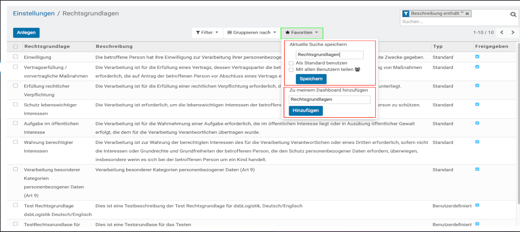 - Durch Auswahl der Schaltfläche „Favoriten„, können Sie, Ihre Suche speichern und entscheiden, ob Sie diese „Als Standard“ verwenden möchten oder „Mit allen Benutzern teilen“ möchten. Außerdem besteht die Möglichkeit, die benutzerdefinierte Suche, auf Ihr eigenes „Dashboard“ zu integrieren.