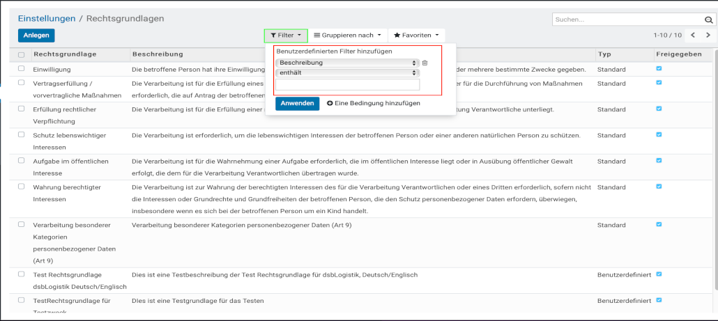 - Durch Auswählen der Schaltfläche „Filter„, können Sie einen vorgefertigten Filter für die Anzeige verwenden, oder Ihren Wünschen entsprechend, einen neuen Filter anlegen.