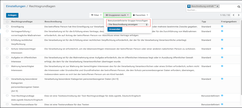 - Möchten Sie zur besseren Übersicht die Anzeige in verschiedenen Gruppen sortiert Anzeigen lassen, können Sie dies durch die Schaltfläche „Gruppieren“ erledigen. Durch Anlegen der Benutzerdefinierten Gruppe, wird die Ansicht in die jeweiligen Gruppen aufgeteilt und dementsprechend angezeigt.