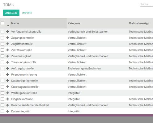 - Neues Verzeichnis: Verwalten Sie Ihre technischen und organisatorischen Maßnahmen.z.B.: Zutrittskontrollen, Datenintegrität, Eingabekontrollen, Zuverlässigkeit