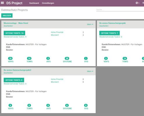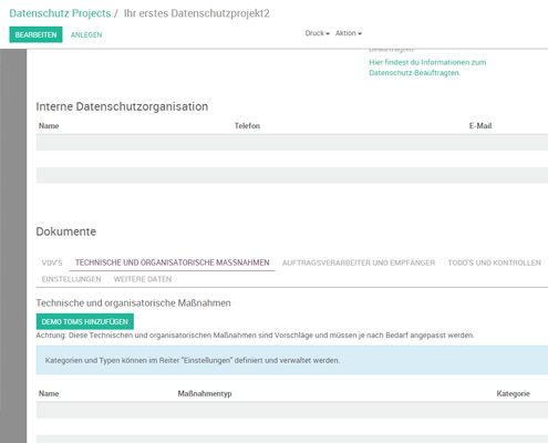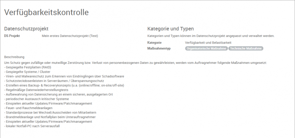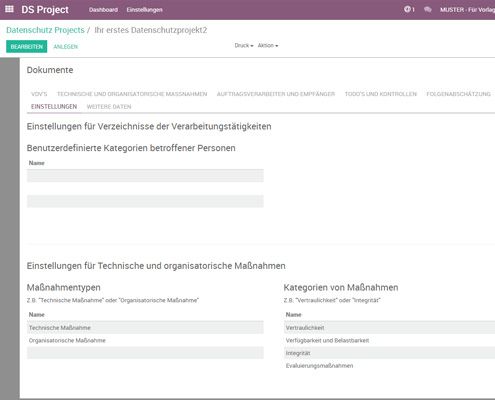 - Typen und Kategorien von Maßnahmen: Jedes Projekt hat von uns die allgemein bekannten Typen und Kategorien von Maßnahmen erhalten. Eigene und Bestehende können selbstverständlich in den Einstellungen des Datenschutzprojekts verwaltet werden.