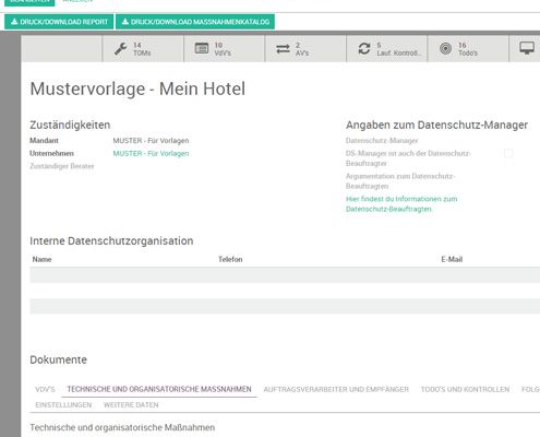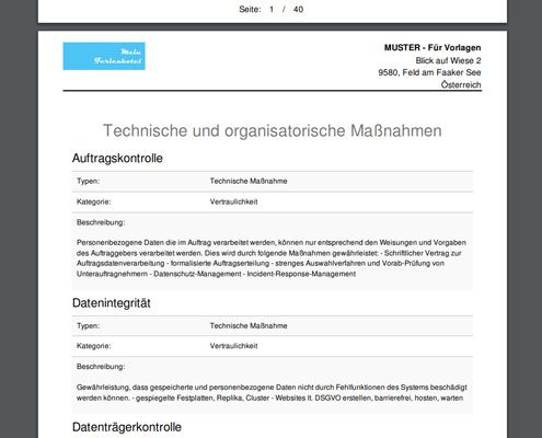 Die berstehenden TOMs bei den VdV’s sind nicht verloren. Diese werden pro VdV als „individuelle technische oder/und organisatorische Maßnahmen“ aufgelistet. Somit besteht für jede VdV weiterhin die Möglichkeit exklusiv für diese VdV technische und organisatorischen Maßnahmen zu hinterlegen. - Styling: Das Styling des Datenschutzprojekt-Reports wurde geringfügig angepasst um eine bessere Übersicht zu gewähren.