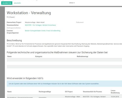 - Verzeichnis der Verarbeitungstätigkeiten: VdV’s können mit den TOMs verbunden werden. Somit wird transparent dargestellt, welche Verarbeitungstätigkeiten (Sales, Buchhaltung, etc.) durch welche TOMs unterstützt werden.