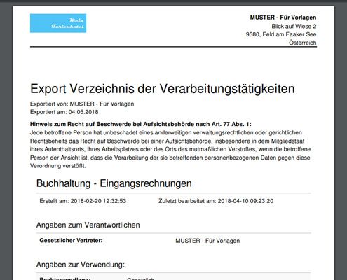 Bei der Auflistung der VdV’s können Sie nun mehrere Verzeichnisse über die Checkbox auswählen und über die Druckfunktion einen „VdV Bericht für Betroffene“ exportieren. Dieser Bericht beinhaltet keine personenbezogenen Daten von Verantwortlichen oder Auftragsverarbeiter.
