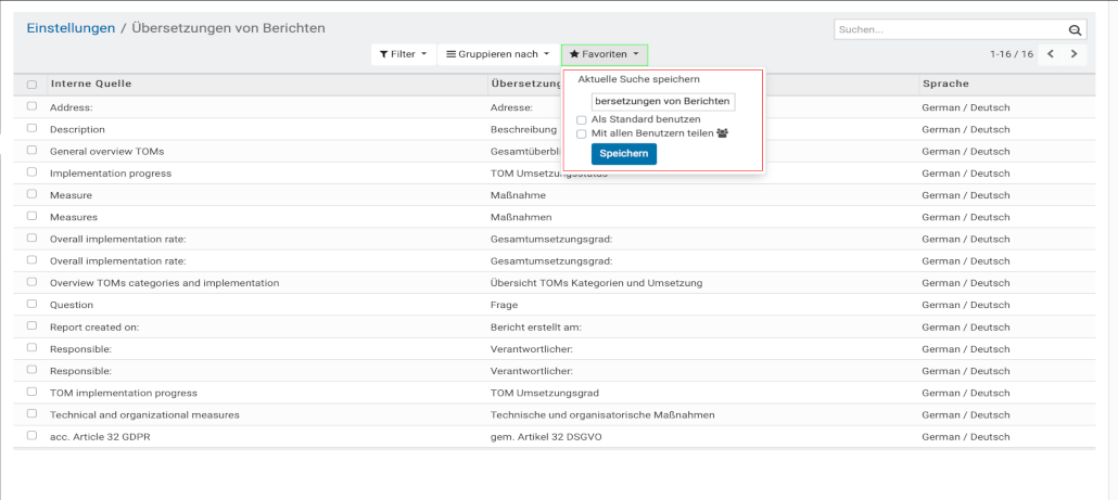- Durch Auswahl der Schaltfläche „Favoriten„, können Sie, Ihre Suche speichern und entscheiden, ob Sie diese „Als Standard“ verwenden möchten oder „Mit allen Benutzern teilen“ möchten. Außerdem besteht die Möglichkeit, die benutzerdefinierte Suche, auf Ihr eigenes „Dashboard“ zu integrieren.
