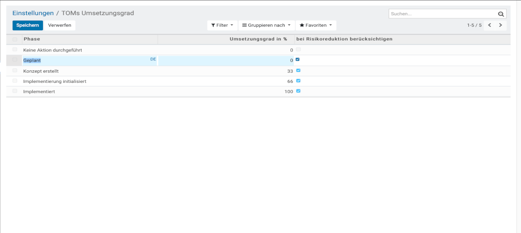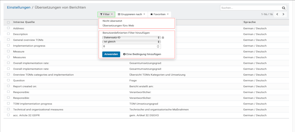 - Durch auswählen der Schaltfläche „Filter„, können Sie einen vorgefertigten Filter für die Anzeige verwenden, oder Ihren Wünschen entsprechend, einen neuen Filter anlegen.