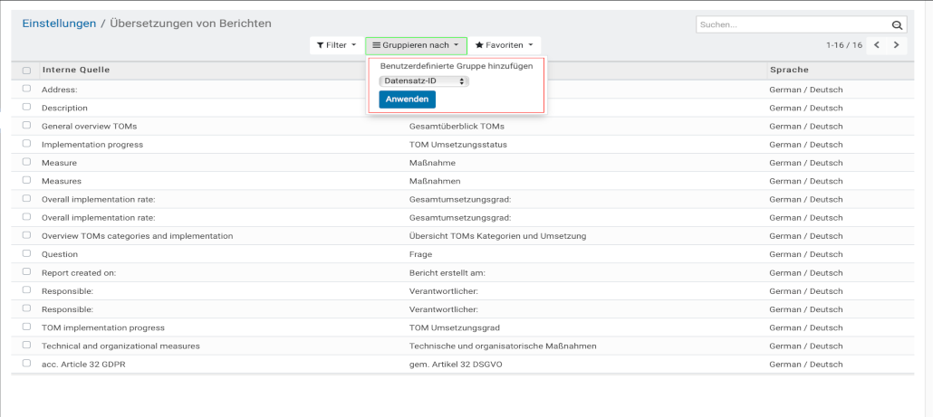 - Möchten Sie zur besseren Übersicht die Anzeige in verschiedenen Gruppen sortiert anzeigen lassen, können Sie dies durch die Schaltfläche „Gruppieren“ erledigen. Durch Anlegen der Benutzerdefinierten Gruppe, wird die Ansicht in die jeweiligen Gruppen aufgeteilt und dementsprechend angezeigt.
