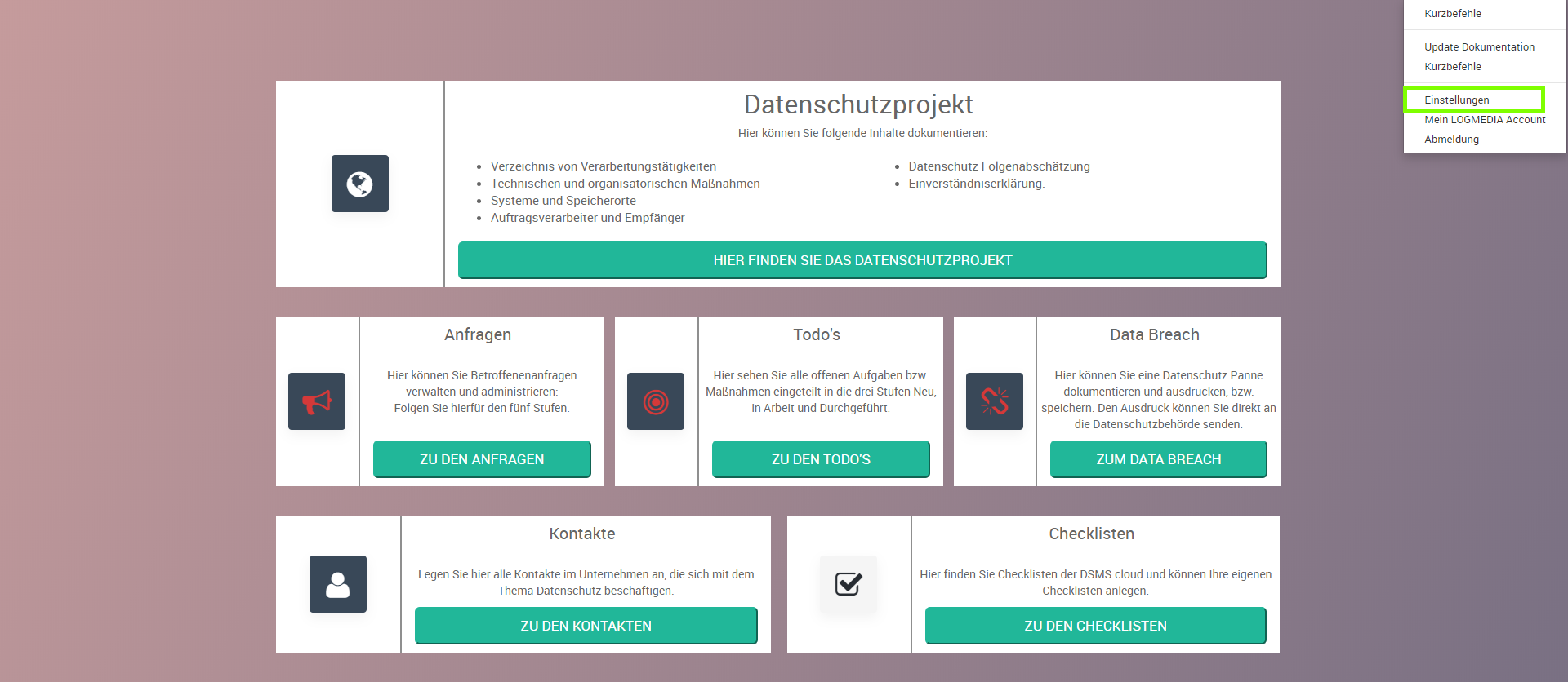 - Loggen Sie sich hierzu in Ihren Account ein und klicken Sie rechts oben auf Ihren Namen. Dort finden Sie den Menüpunkt „Einstellungen“.