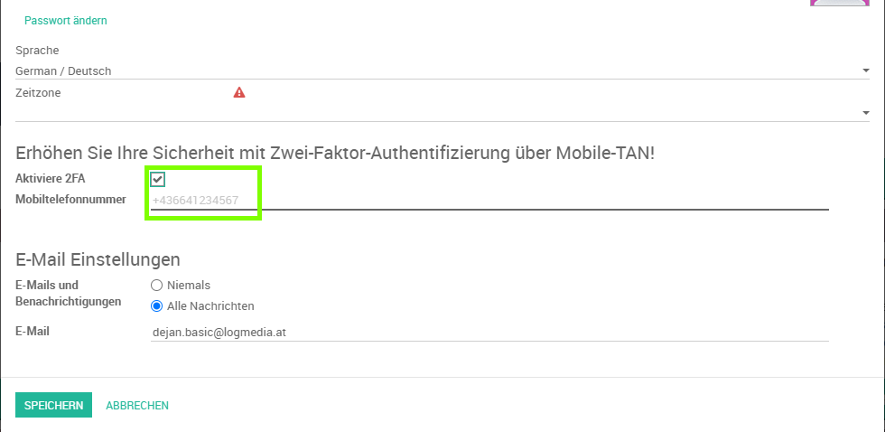 - In den Einstellungen finden Sie den Bereich für die Aktivierung der 2FA. ACHTUNG: Geben Sie die Telefonnummer immer in folgendem Format an: +43XXXXXXXXXXX
